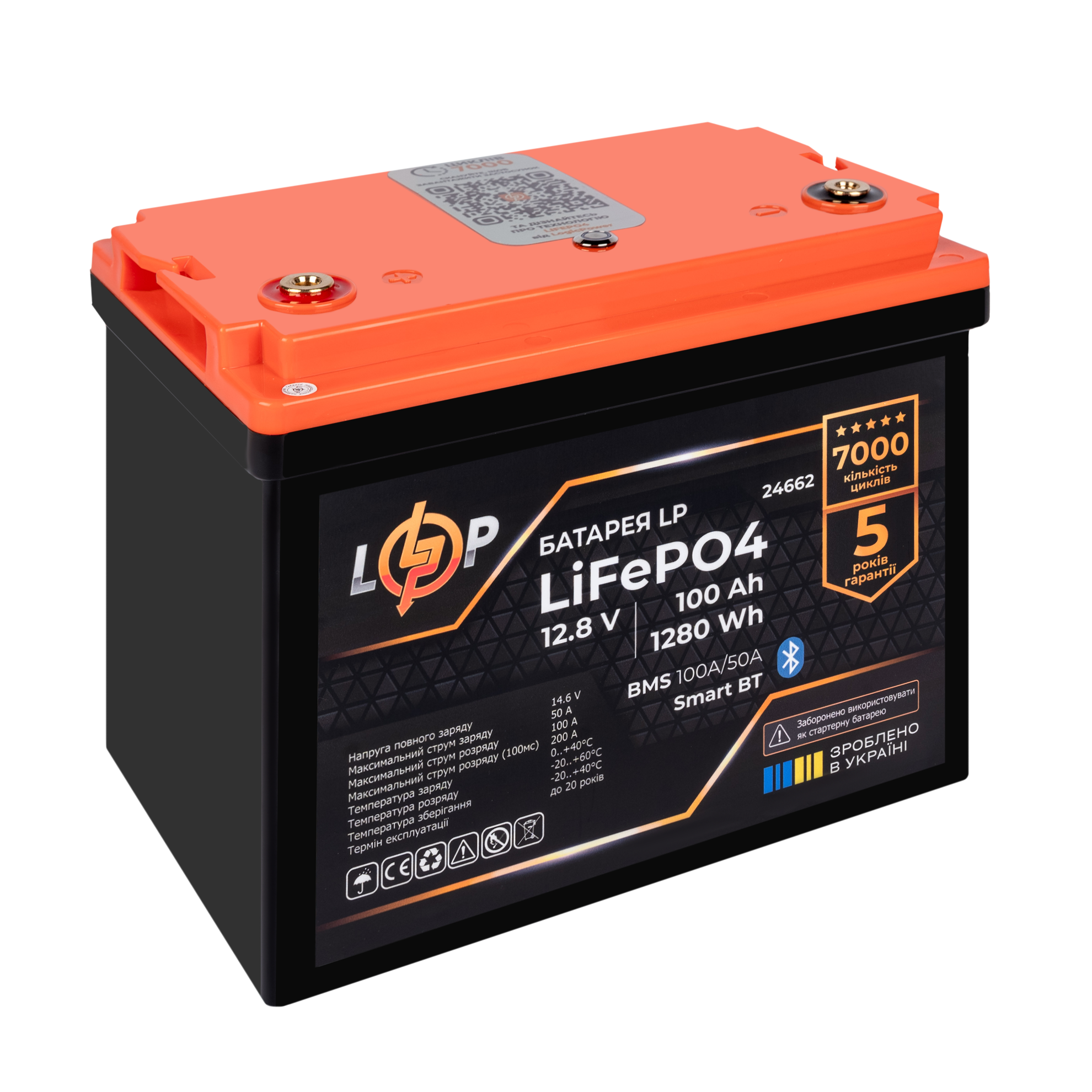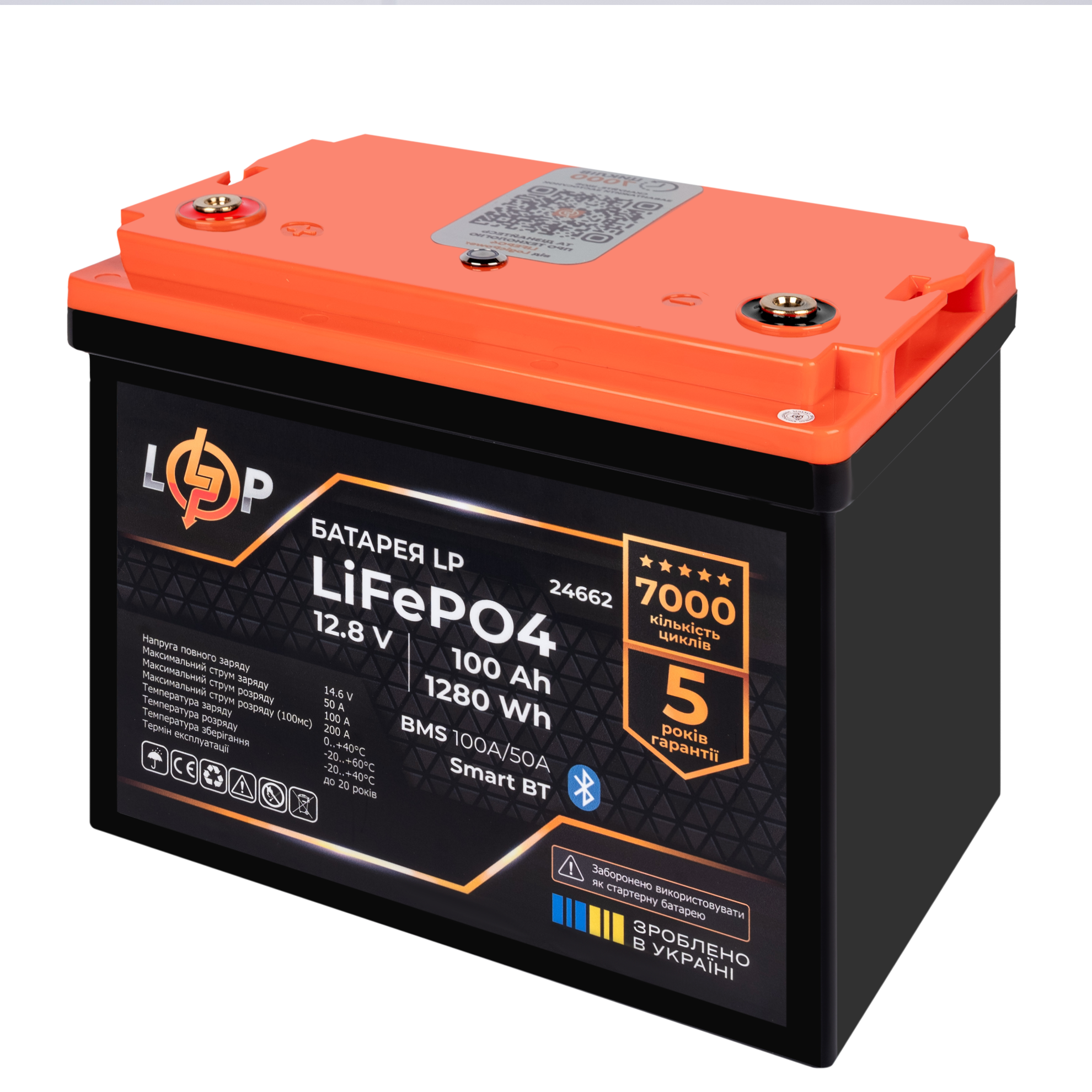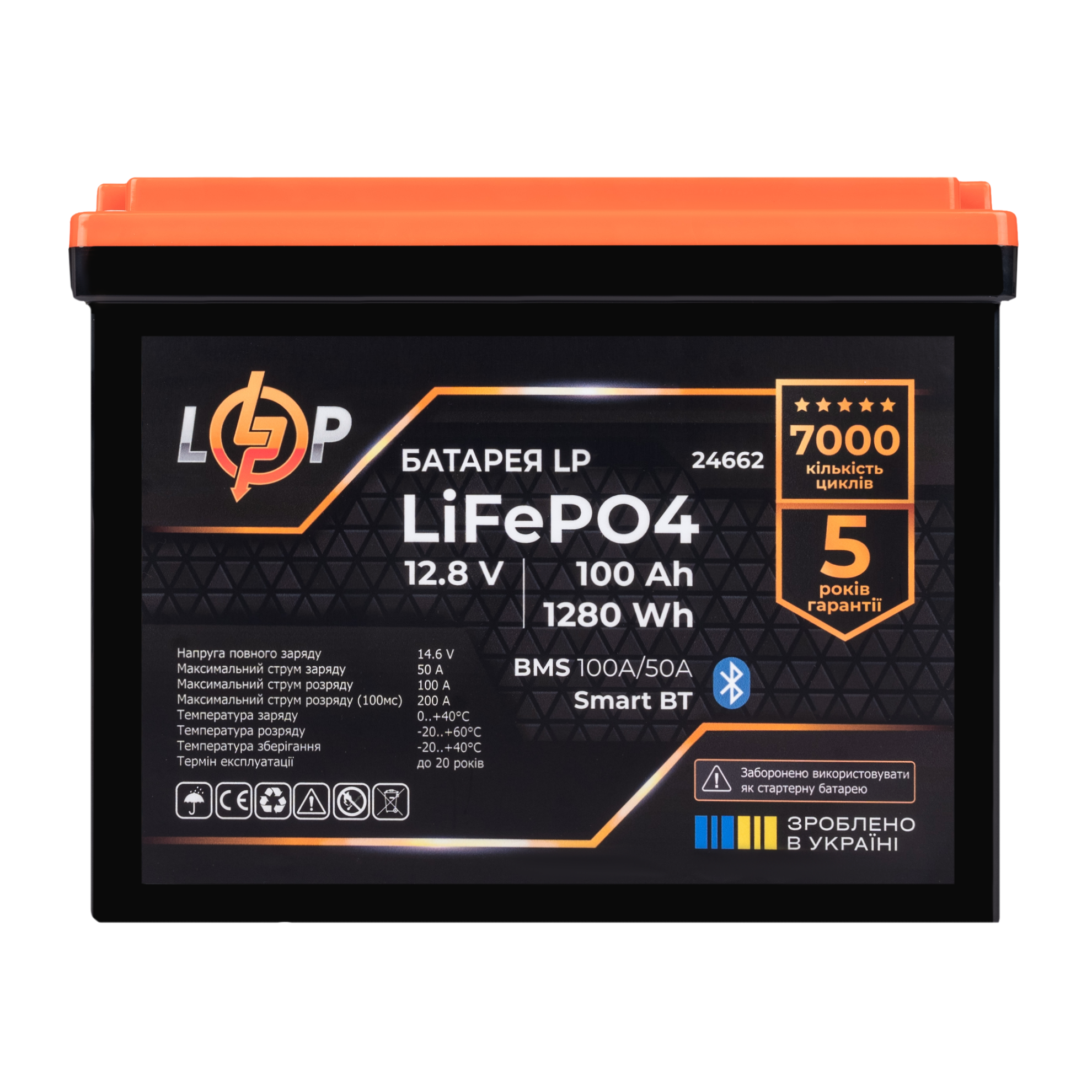 Акумулятор LP LiFePO4 12,8V – 100 Ah (1280Wh) (BMS 100A/50А) пластик Smart BT