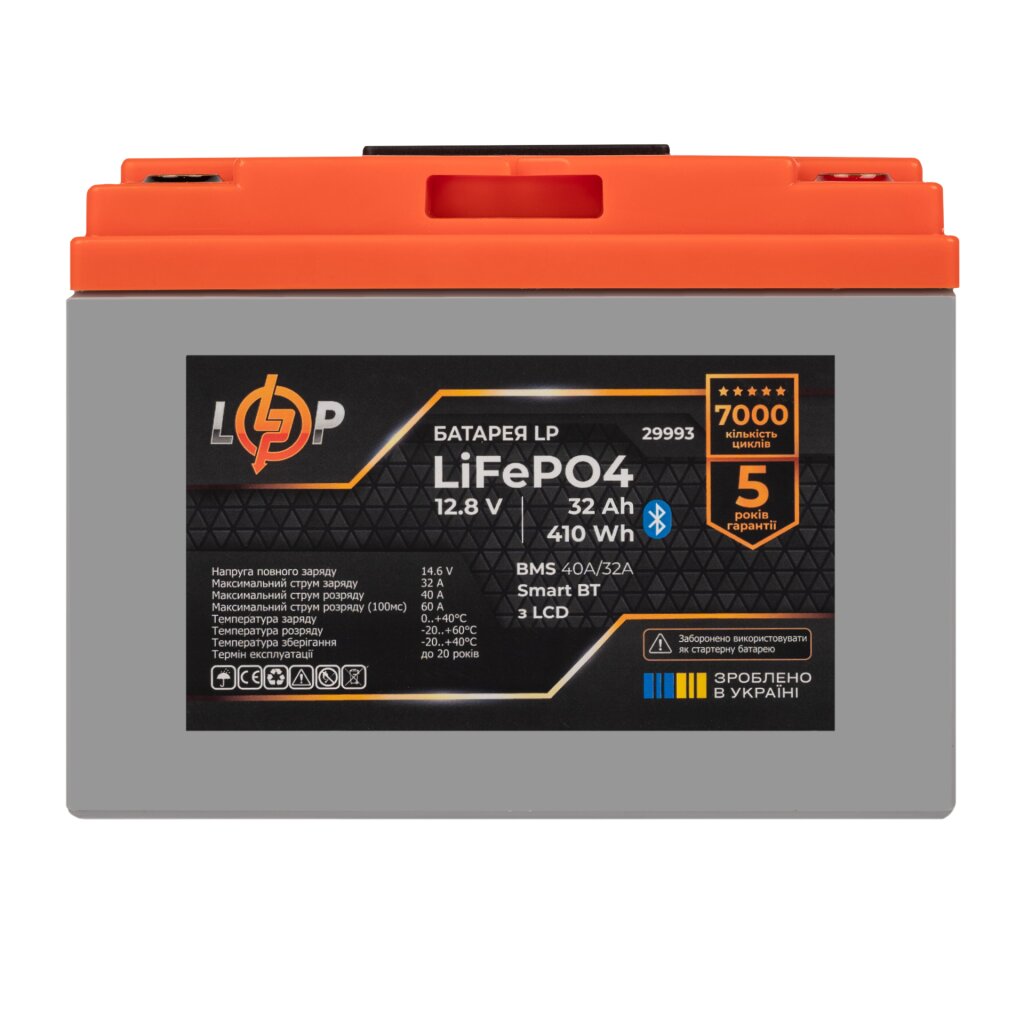 Акумулятор LP LiFePO4 12,8V – 32 Ah (410Wh) (BMS 40А/32A) пластик LCD Smart BT