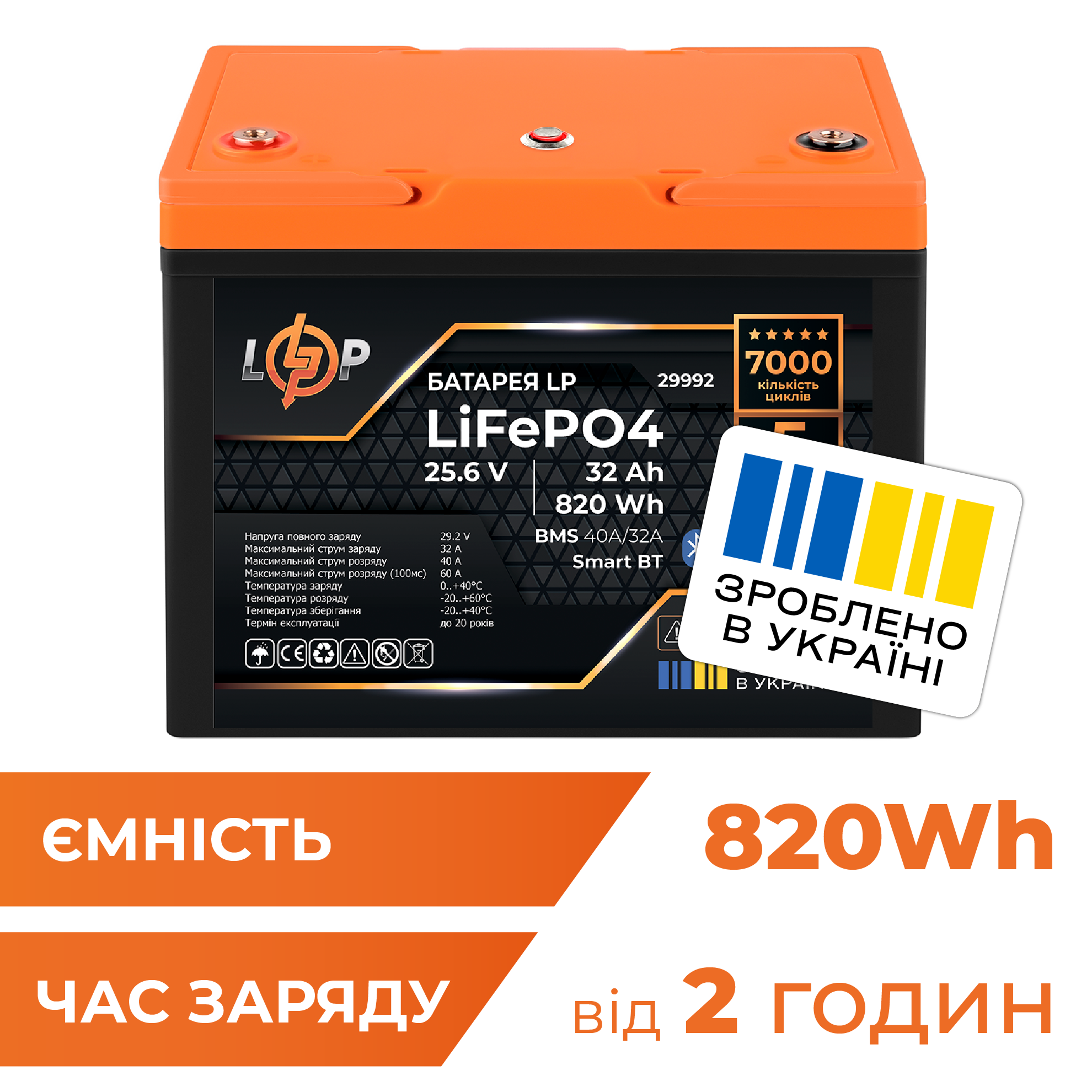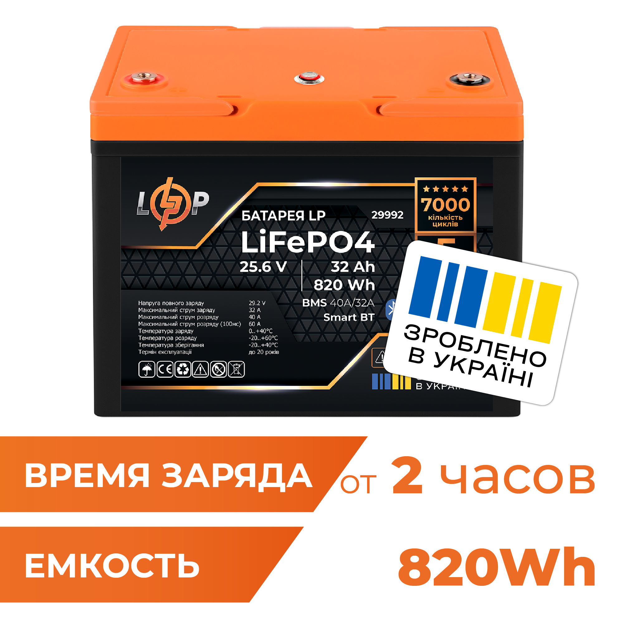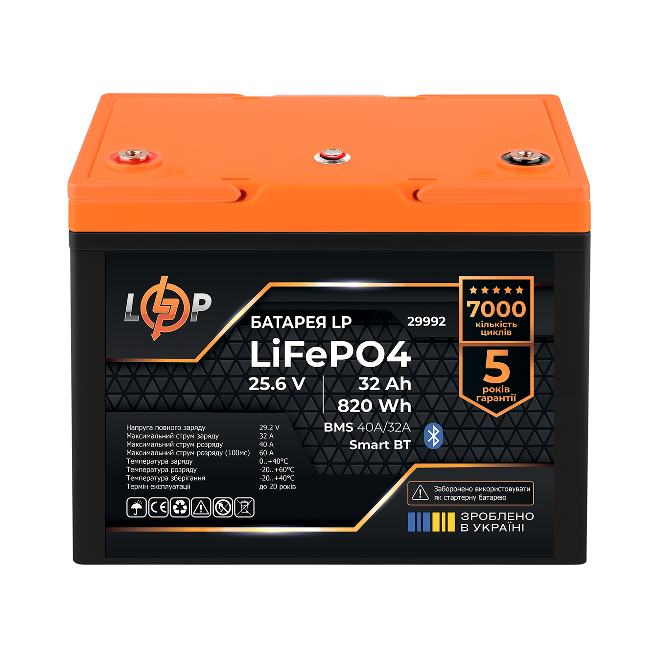 Акумулятор LP LiFePO4 25,6V – 32 Ah (820Wh) (BMS 40A/32А) пластик Smart BT