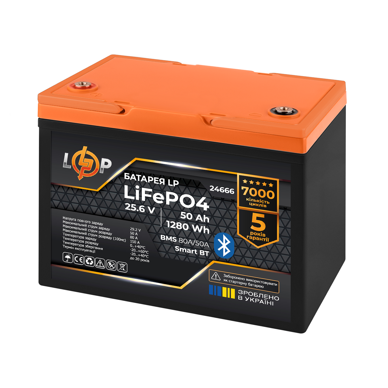 Акумулятор LP LiFePO4 25,6V – 50 Ah (1280Wh) (BMS 80A/50А) пластик Smart BT
