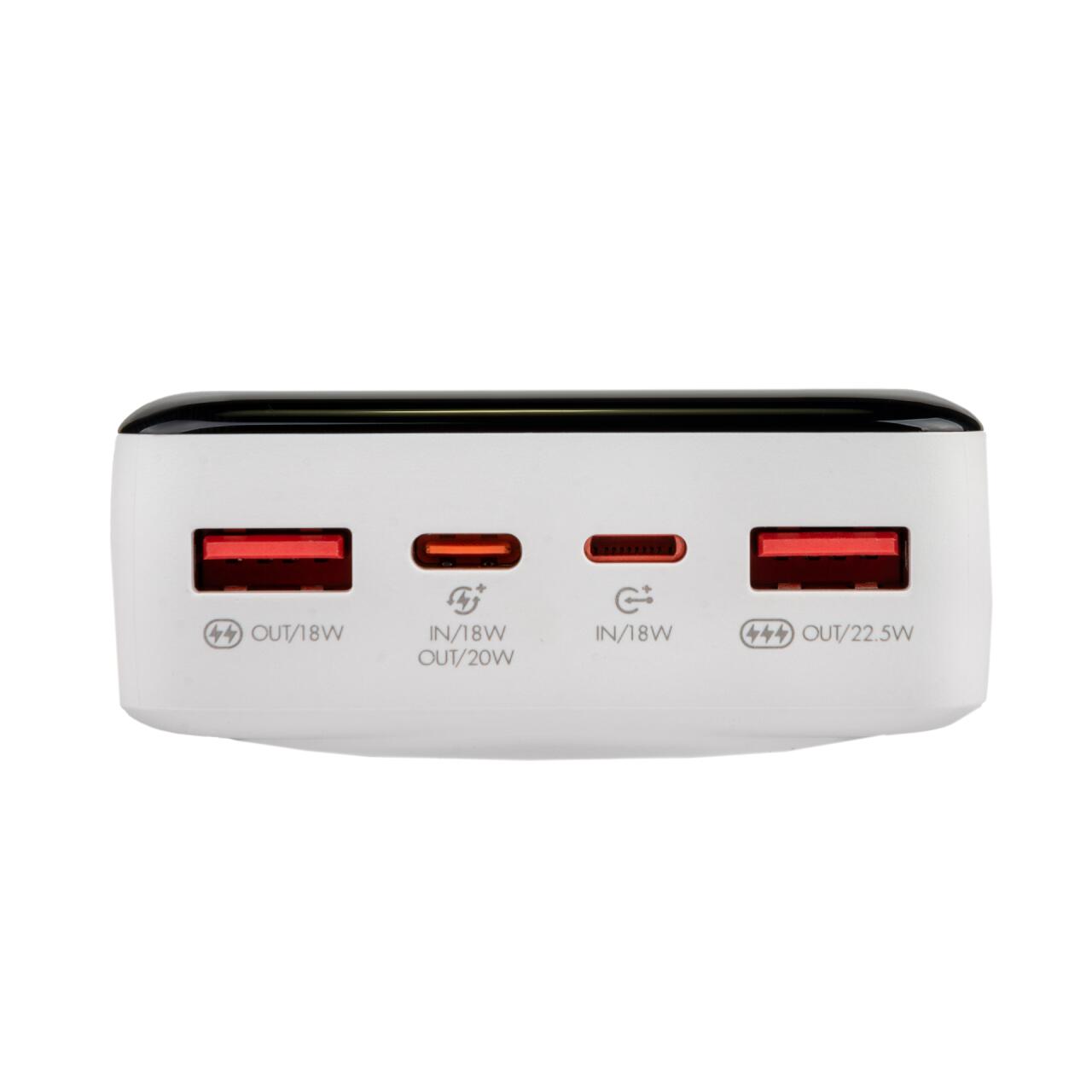 Ємність акумулятора становить 20000 мАг, забезпечуючи потужність, достатню для кількох зарядок.