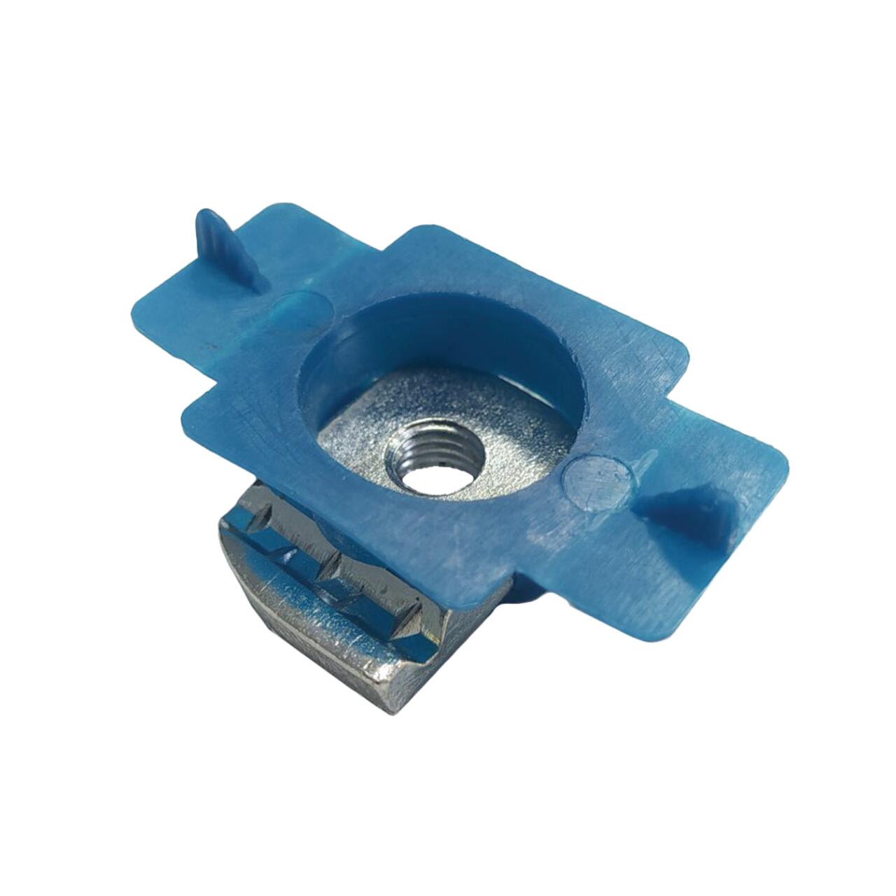 Гайка монтажна М8 із пластиковим фіксатором, для кріплення сонячних панелей. Форма гайки дозволяє зробити швидкий та надійний монтаж сонячних панелей, пластиковий корпус надійно утримує гайку в пазі напрямного профілю. Завдяки прямокутній формі гагка заводиться у профіль у будь-якому місці по довжині профілю після повороту на 90 градусів, вона фіксується пластмасовим фіксатором і надійно тримається та не провертається. При цьому гайку завжди можна перемістити на потрібну відстань по довжині напрямного профілю. Це дозволяє швидко та надійно змонтувати сонячні модулі. Навіть якщо при установці профілю було допущено незначні помилки, завдяки продуманій конструкції їх легко виправити.