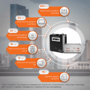 Комплект резервного живлення встановлюється та підключається стаціонарно. Усі функції: від стабілізації напруги до заряджання акумулятора виконуються автоматично.
