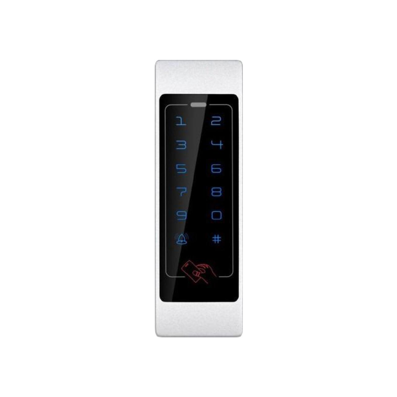 Автономна сенсорна клавіатура/контролер доступу (СКУД) з вбудованим зчитувачем карт і брелоків EM-Marine (125 kHz). Має підсвічування клавіатури, спосіб розблокування: код, картка. Ця автономна сенсорна клавіатура призначена для встановлення в приміщенні.