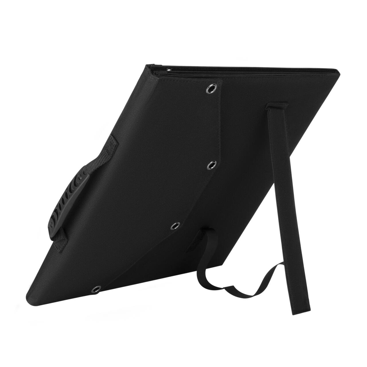 - Портативна сонячна панель виготовлена з якісних фотоелементів із високою продуктивністю. Клас захисту від шкідливих впливів довкілля IP67