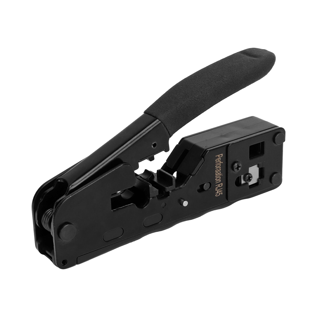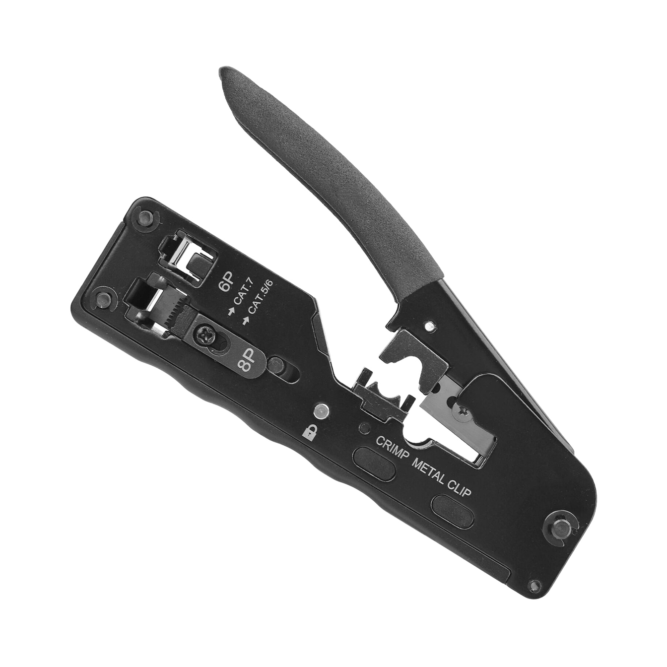 Ручний інструмент для обтискання UTP/STP прохідних конекторів 8P8C/RJ45, а також для телефонних 6P6C/RJ12 та 6P4C/RJ11. Інструмент може бути використаний і для обтиску та стандартних ненаскрізних роз'ємів RJ45. У корпус інструменту вбудована обрізка кабелю і кільцевий затискач для обтиснення екранованого хвостового затискача Shielded Tail Clip. Існує функція перемикання режимів фіксатора кабелю "strain latch", для монтажу роз'ємів різного типу, 5е, 6, 6а, 7, 8 категорії. У конструкції передбачено наявність кнопки блокування "Lock Button", для зручного зберігання та транспортування. Корпус виконаний зі сталі та пластику, у строгому чорному кольорі.